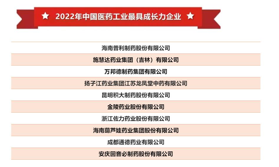 大会期间,备受瞩目的“中国医药工业百强”、“中国医药企业社会责任优秀案例”、“中国医药研发产品线最佳工业企业”、“中国医药工业最具投资价值企业”、“中国医药工业最具成长力企业”和“中国医药新锐创新力量”等六大榜单盛大发布,PA尊龙凯时- 官方网站荣登2022年“中国医药工业最具成长力企业”榜单。